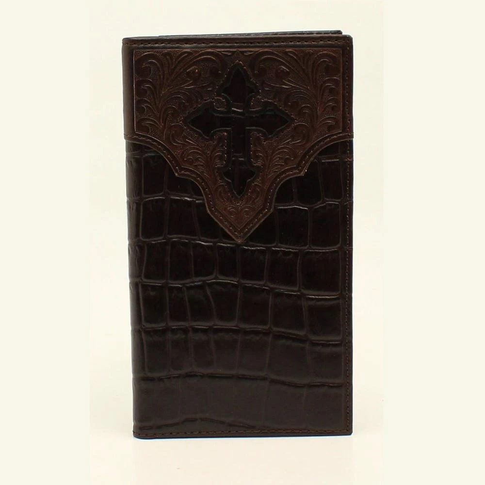 This Ariat™ rodeo wallet by M&F Western Products® features a faux crocodile leather with a scroll embossed overlay that has a cross cutout. Inside features a clear ID slot, credit card slots, and a place for your cash.