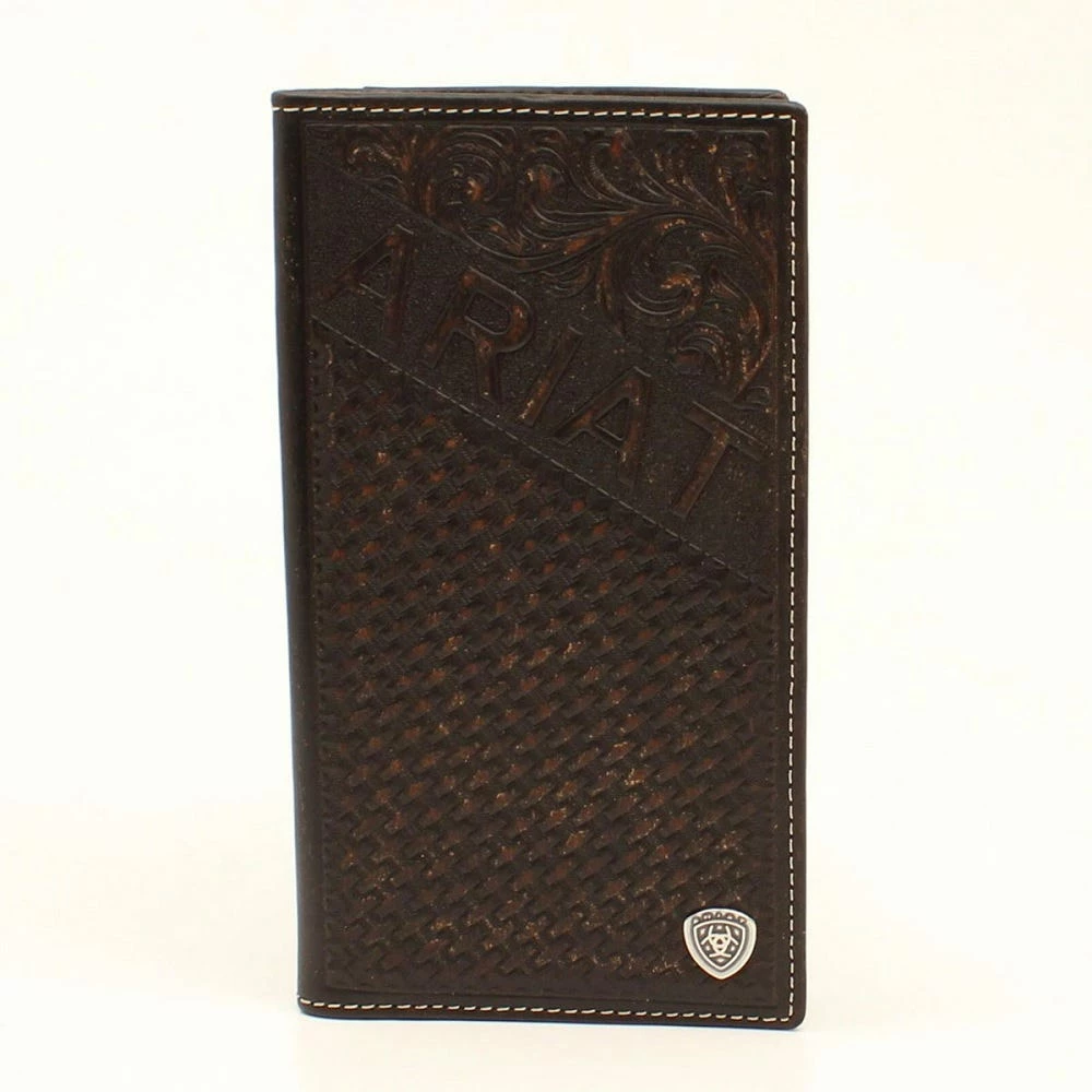 Keep your checkbook, credit cards and cash organized in one place with this Ariat rodeo wallet by M&F Western Products. This great wallet has a basket weave embossed bottom accented with a silver concho. There is an Ariat Signature Logo diagonally across the front of the wallet. The top corner of the wallet has a beautifully embossed top. Inside features multiple compartments for your credit cards, cash, and an ID window