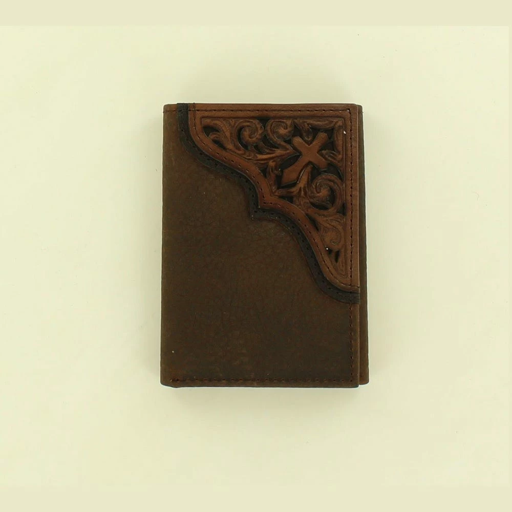 This rustic Ariat trifold wallet by M&F Western Products® features a stamped cross overlay with black trim over distressed leather. Inside features multiple compartments for your credit cards, cash, and a place for your ID.