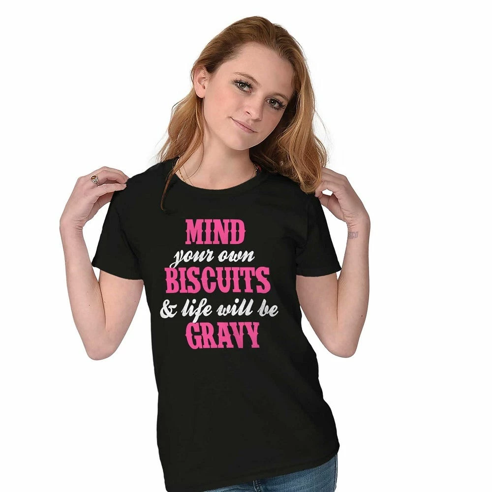Brisco Apparel Mind Your Own Biscuits Life Will Be Gravy Women’s Tees Shirts for Ladies – 14X3025000LBLK