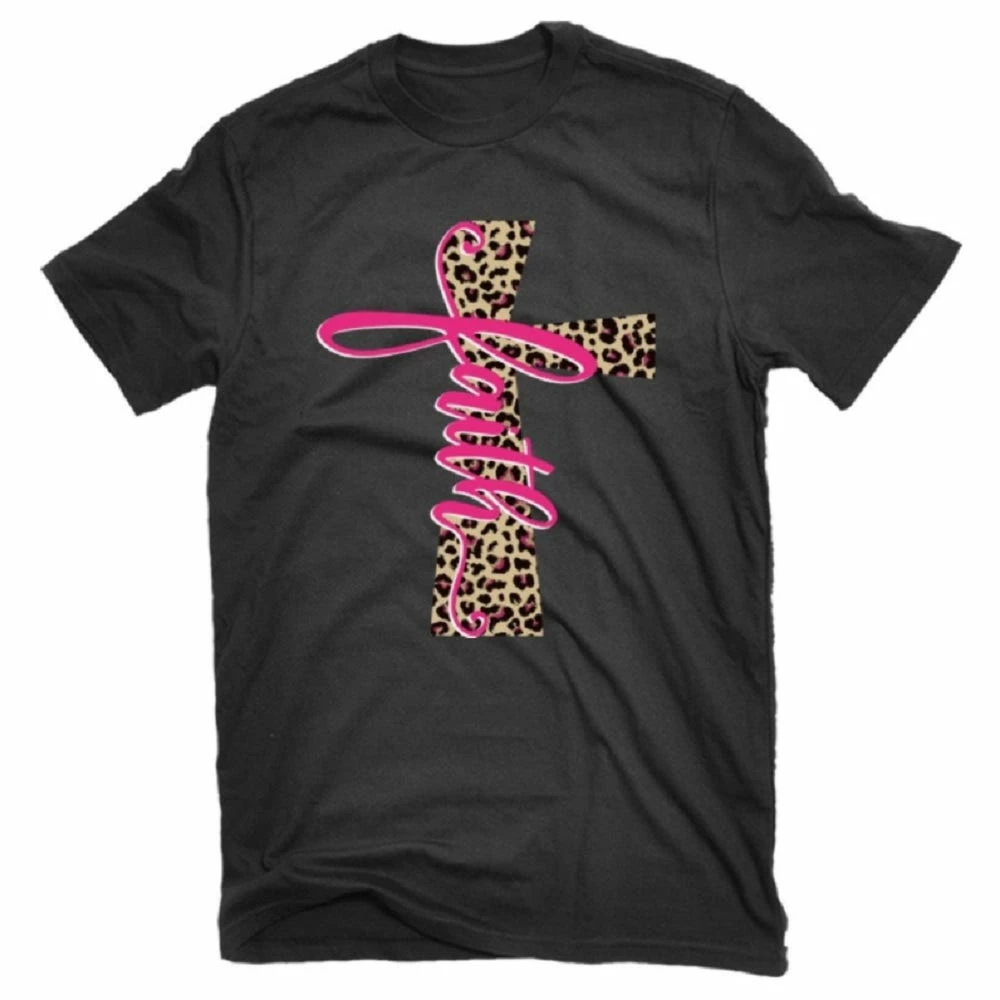 - Front Chest Screen Print: “Faith” Leopard Cross