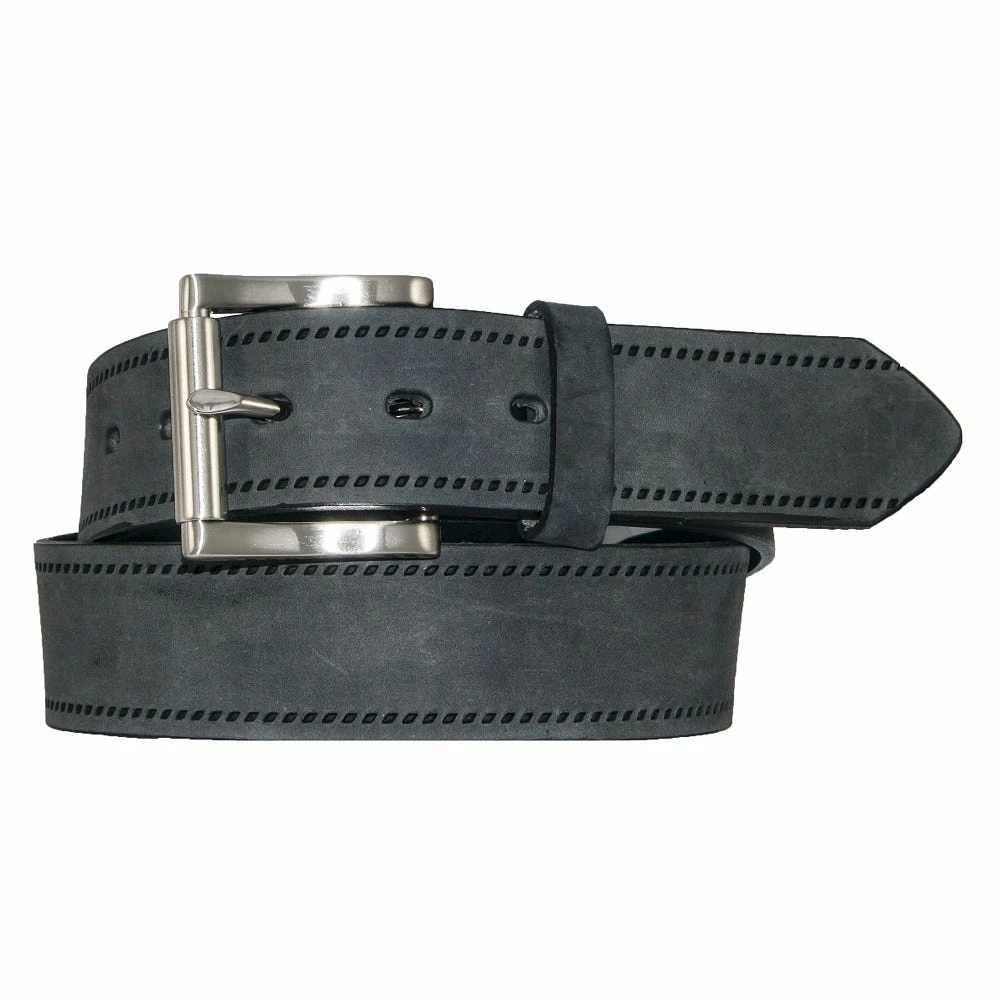 Hand made in the USA. This is solid piece of black Roughout leather with stylish embossed stitching along the body of the belt. Heavy duty snaps and a stylish buckle make this a durable everyday belt.