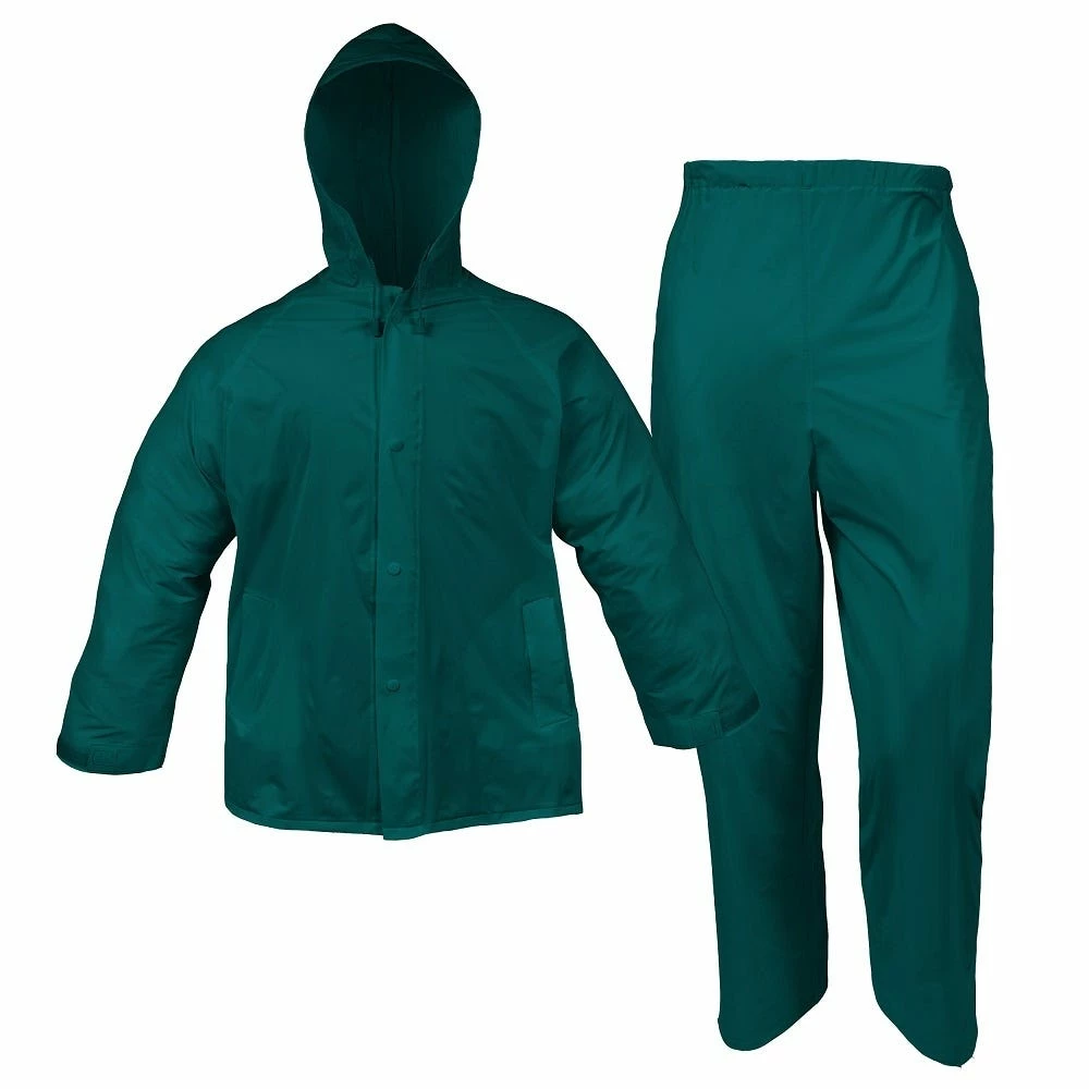 On days when the rain is there to stay, you still have work to get done. Pull on this sturdy green PVC rain suit and get to work. The jacket features wrist cuffs with adjustable Velcro closures, side entry pockets, and vented back and underarms – all designed to keep you comfortable and dry. The pants have an elastic waist and adjustable snap leg cuffs for a perfect fit. Now you can be productive right through the rain.