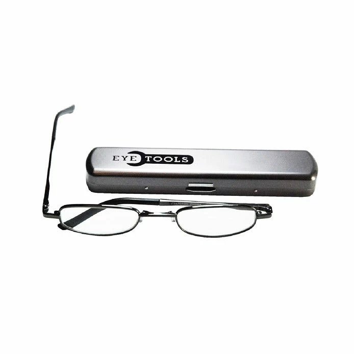 High Quality, Metal Frame Reader with spring hinge rubber temples. Features an aspheric lens. Comes with metal case.