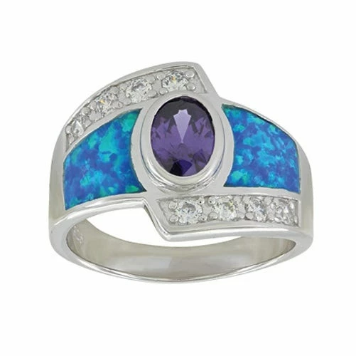 A sterling silver ring with a center oval purple stone clasped by an inset of opal on either side with lines of clear stones wrapping the edges.