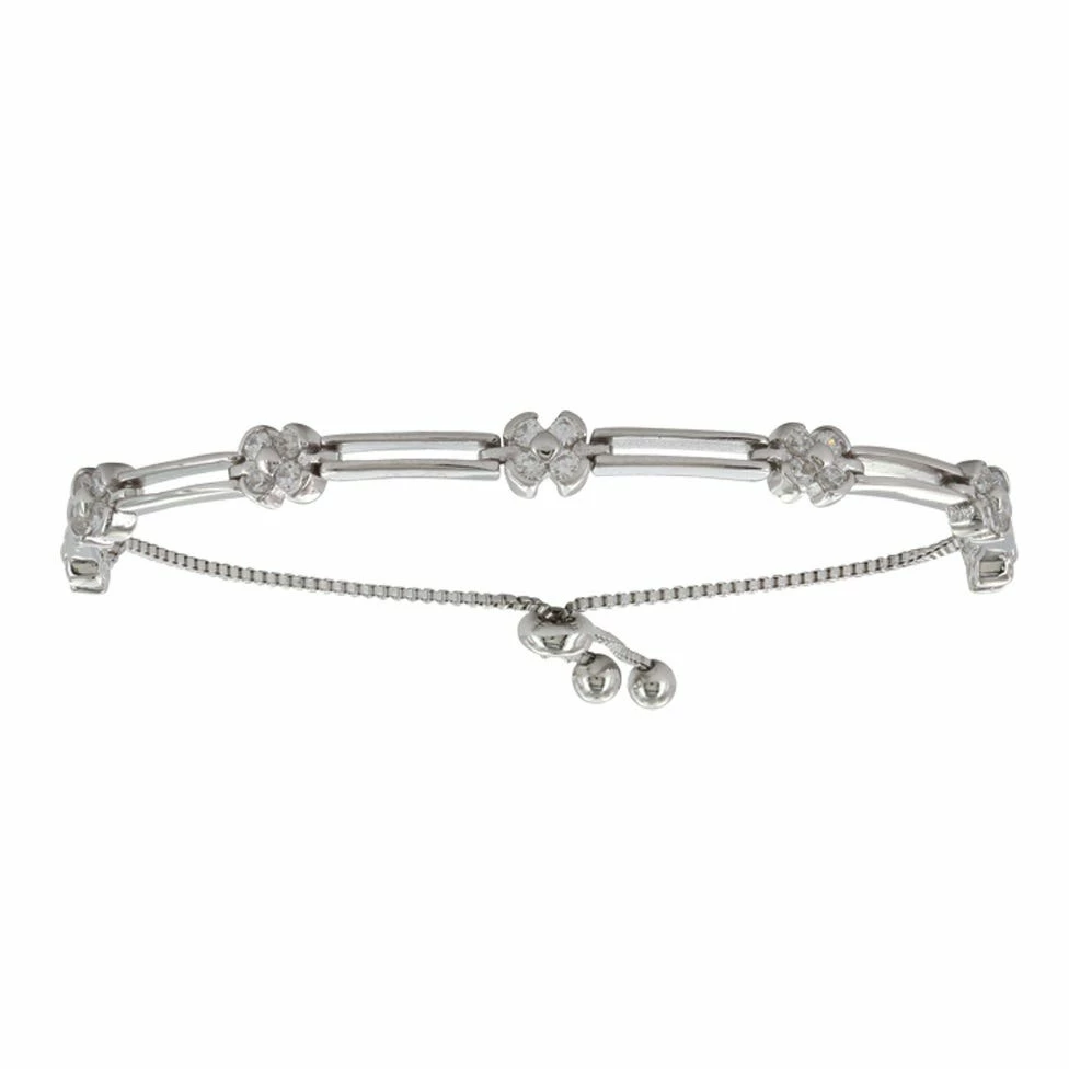 A silver finished link bracelet with a smooth thin double bar alternating with a clear four stone cluster design in a silver toned frame. Bracelet has a bolo style fastening.