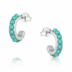 Is it true that everything is cuter when it’s mini? Certainly the case with these beauties! Try on our small studded small hoop earrings. They are quaint with a large pop of color. Studs of turquoise line the curve of the hoop with fine, clean silver-toned lining both sides. Hypoallergenic stainless steel post backs fasten these earrings.