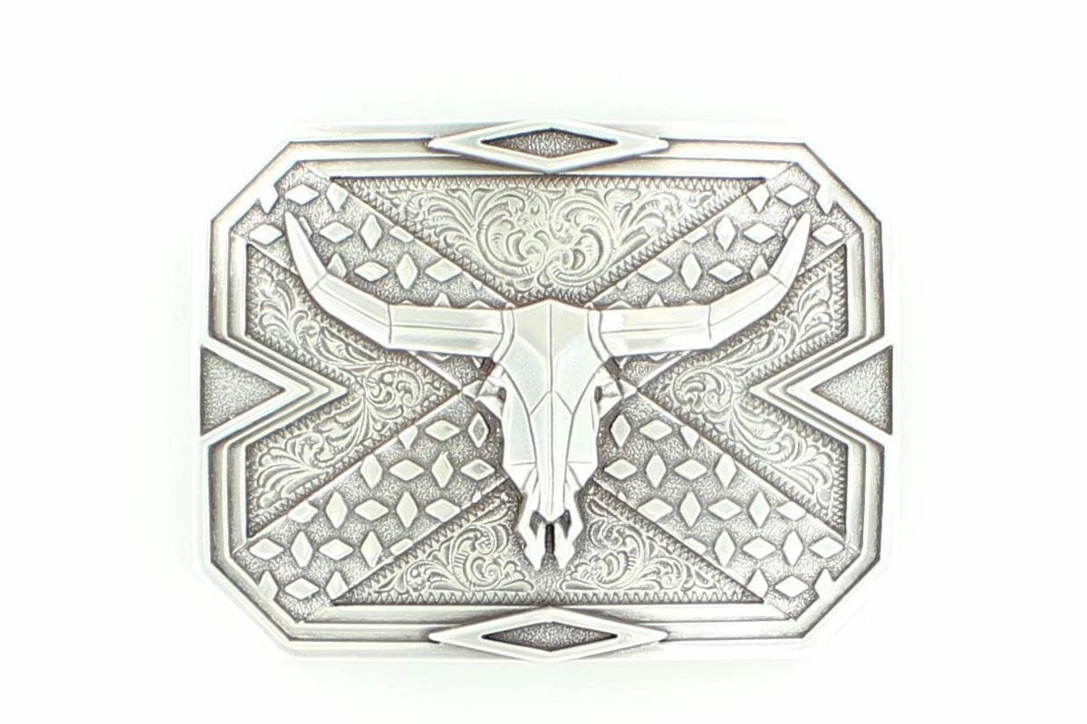 The Nocona Rectangular Steer Head Western Belt Buckle 37680 features the images of a steer skull in center. The rectangular belt buckle measures about 3″ x 4″ with beveled corners.