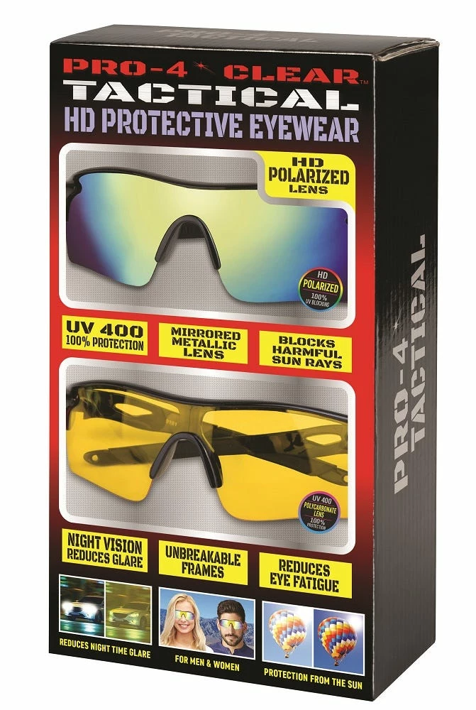 The Pro-4 Tactical CLEAR VISION HD Protective Eyewear provide shock-, impact-, and scratch-resistance; a clear field of vision; elimination of glare; nearly 100% blockage of harmful sun rays; virtually unbreakable frames; and amazing clarity of vision day or night.